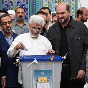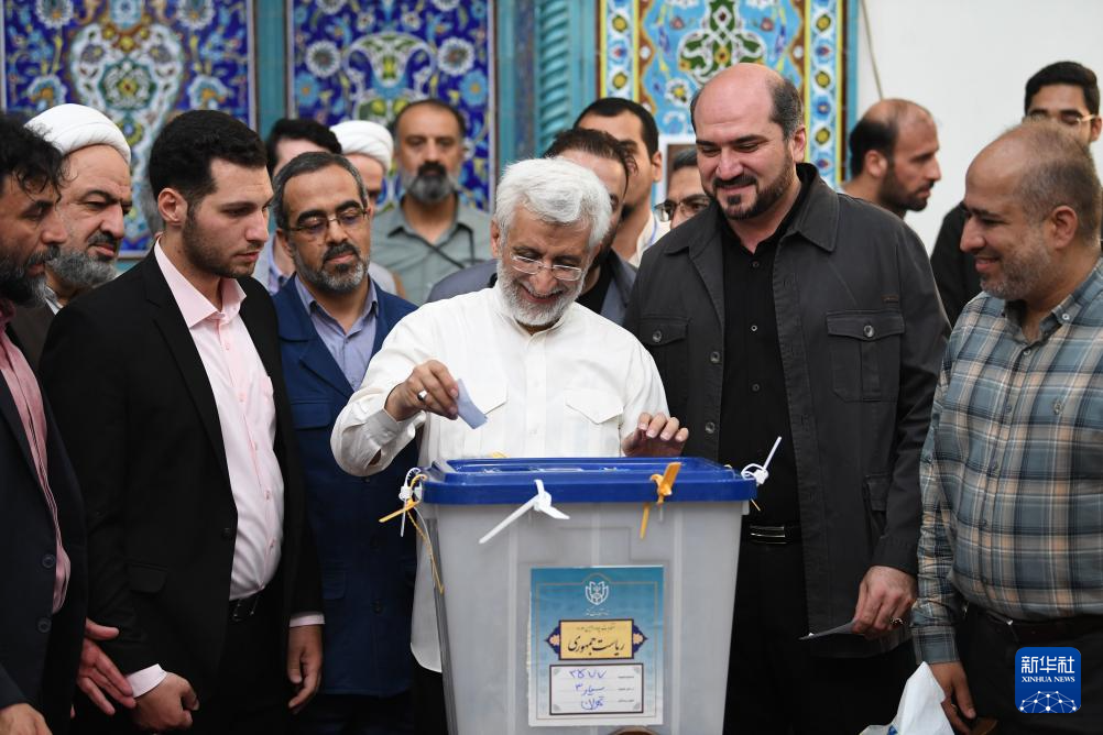6月28日,在伊朗德黑兰,总统候选人、前首席核谈判代表贾利利(前中)在一处投票站参加总统选举投票。
