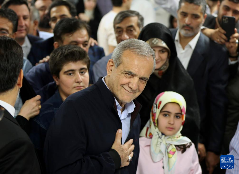 6月28日,在伊朗德黑兰,总统候选人、前卫生部长佩泽什基安(前中)在一处投票站参加伊朗第14届总统选举投票。