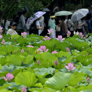 盛夏时节,北京市圆明园遗址公园内二百多个品种的一千余亩荷花盛开,吸引大批游客和市民前来赏荷避暑。