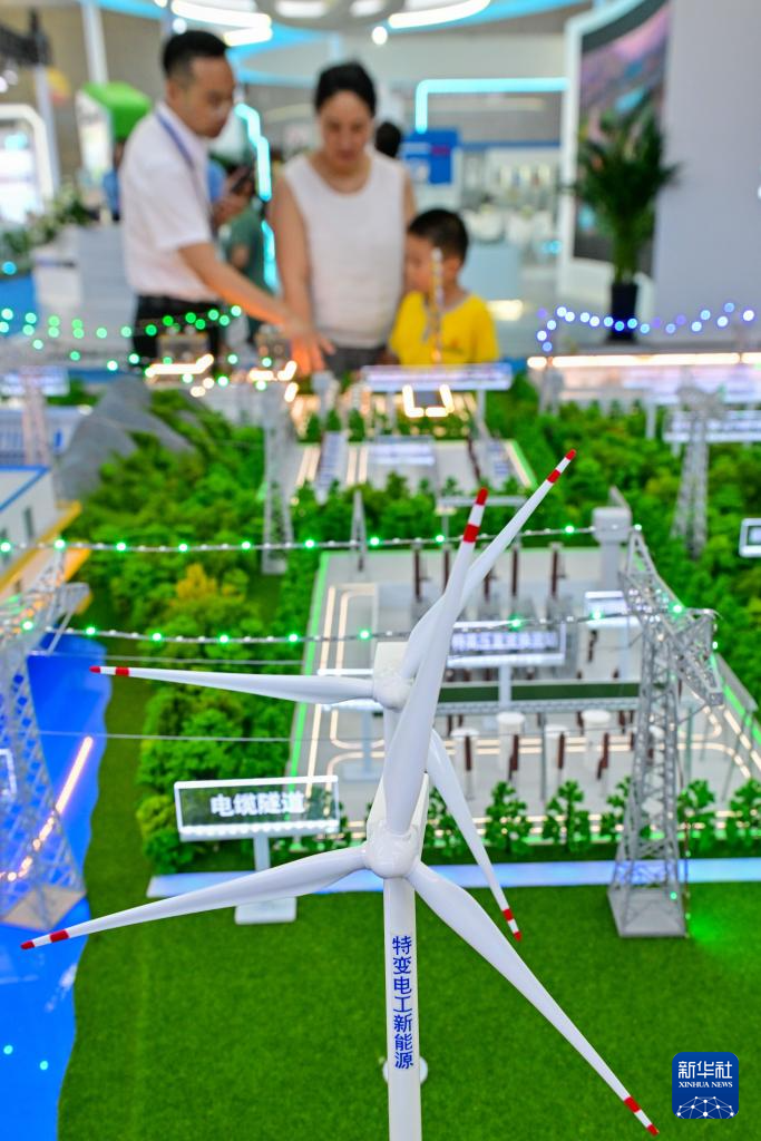 6月27日,在第八届中国-亚欧博览会上,参观者在特变电工展区了解以清洁能源为基础的输变电装备。