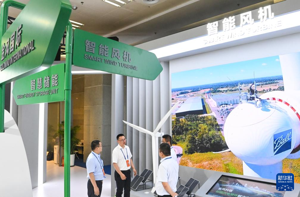 6月27日,在第八届中国—亚欧博览会上,参展商在了解金风科技智能风机性能。