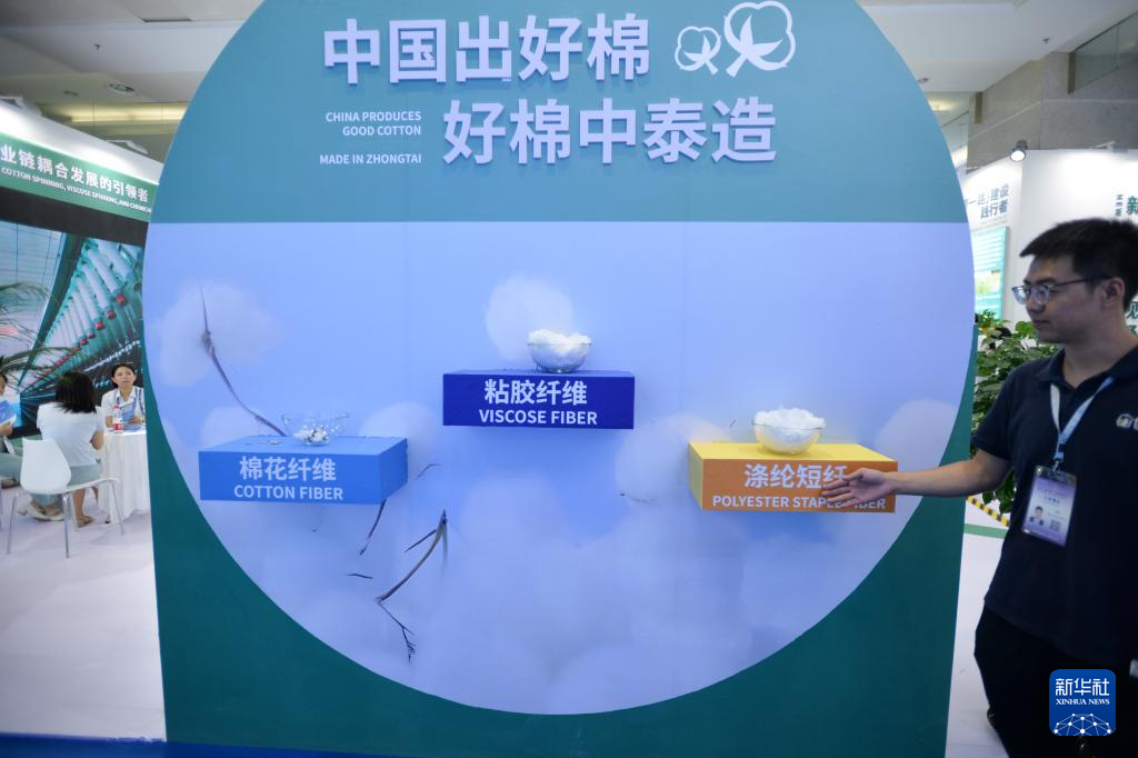 6月30日,在第八届中国—亚欧博览会上,新疆中泰(集团)有限责任公司工作人员展示纺织材料产品。