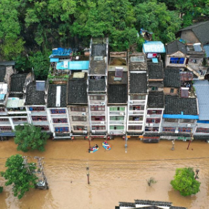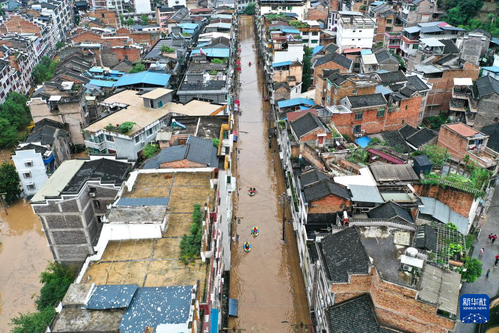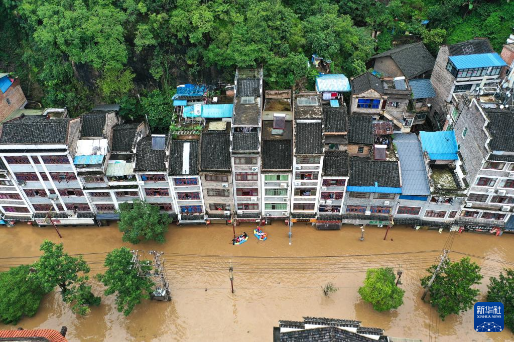 6月29日,在贵州省镇远县㵲阳镇,救援人员划着皮划艇转移被洪水围困的群众(无人机照片)。