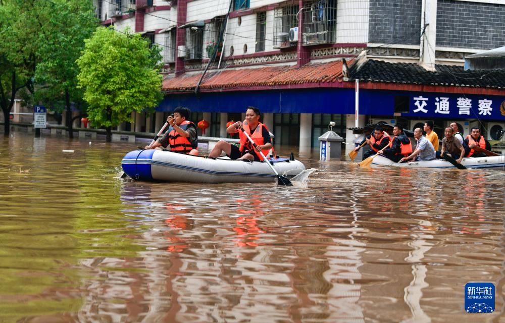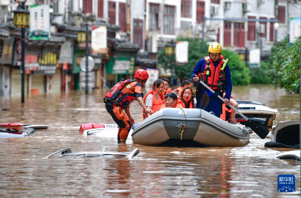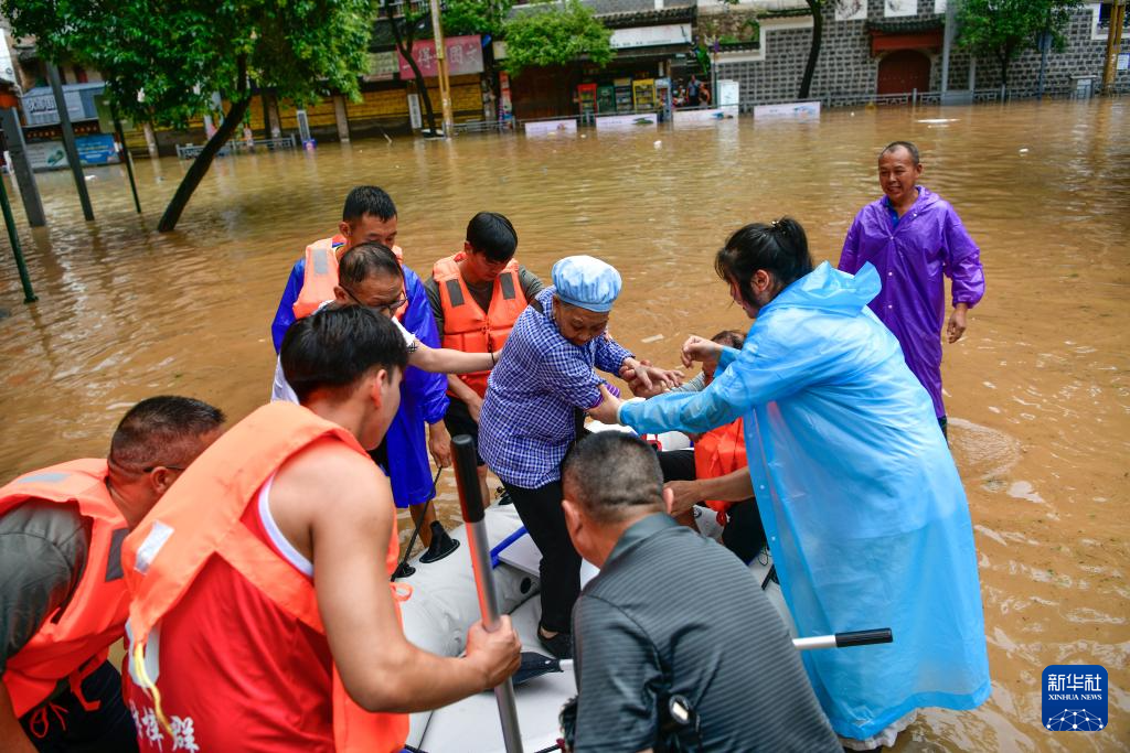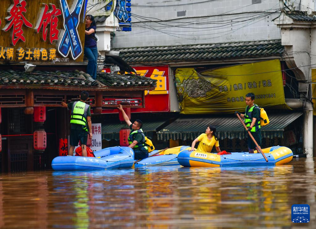 6月29日,救援队员在贵州省镇远县城转移被洪水围困的群众。
