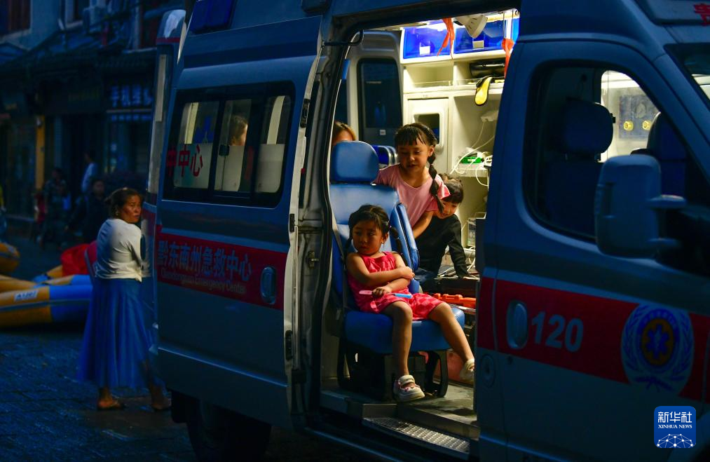 6月29日夜,在贵州省镇远县㵲阳镇,几名安全转移的孩子在救护车上等待。