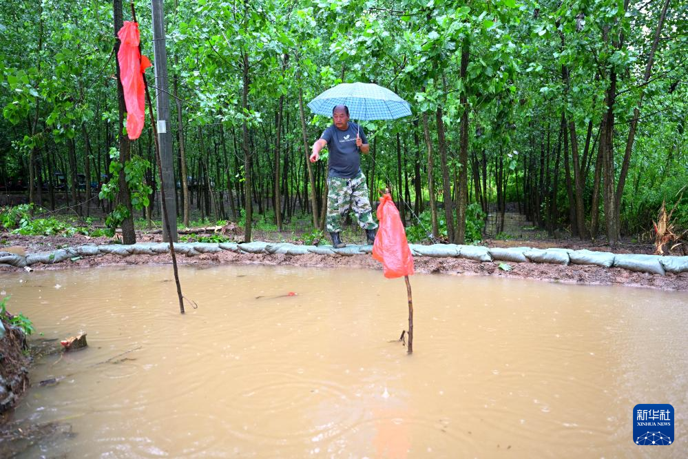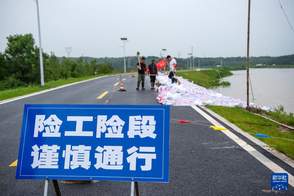 7月2日,在安徽省芜湖市繁昌区孙村镇,巡护人员对长江支流黄浒河堤防的一处险情进行巡查。