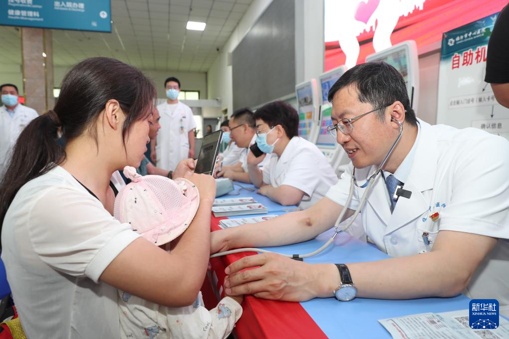 在临汾市中心医院,刘辉(右)在义诊中为一名儿童检查(2024年6月18日摄)。