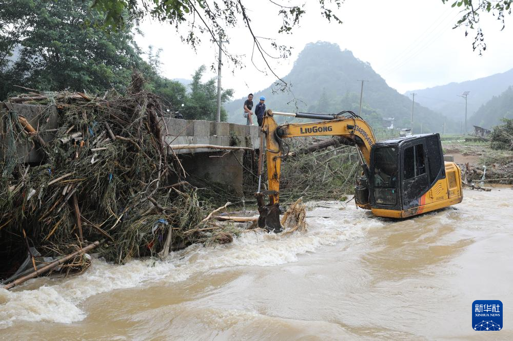 7月2日,在广西柳州市融安县板榄镇泗安村,抢修人员在清理河道。