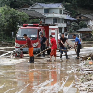 7月2日,在广西柳州市融安县板榄镇泗安村,乡镇专职消防员在冲洗路面。