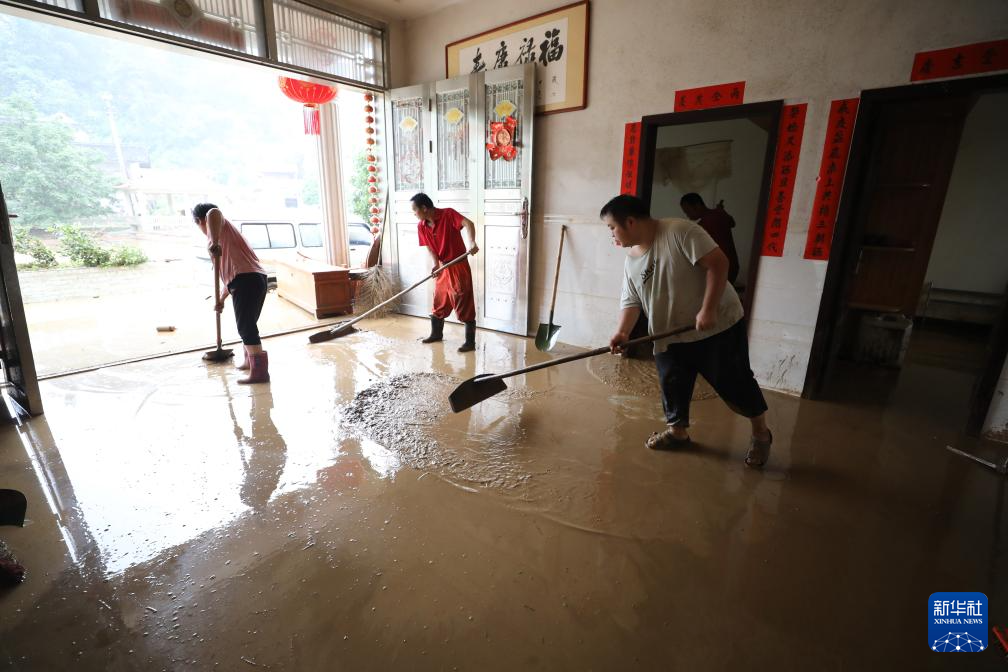 7月2日,在广西柳州市融安县板榄镇泗安村,村民在清理被洪水浸泡的房屋。