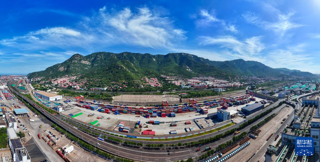 6月26日,“韩国-连云港-中亚”国际多式联运班列从中哈连云港物流合作基地出发,驶往哈萨克斯坦、乌兹别克斯坦(无人机照片)。班列运载的55个大柜此前于6月13日从韩国境内发出,经釜山港海运抵达连云港后转由铁路运输。