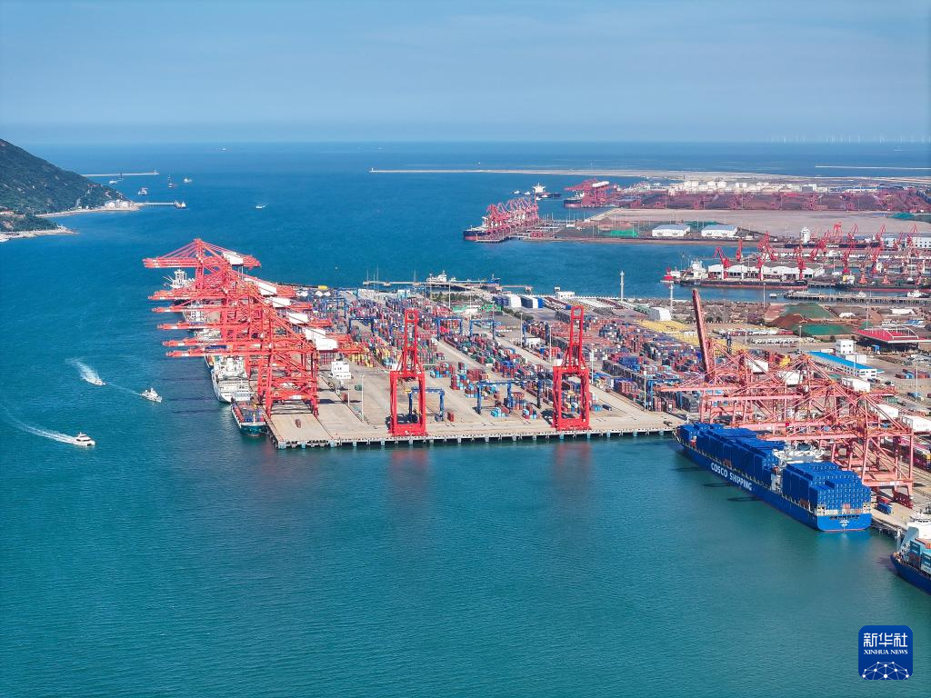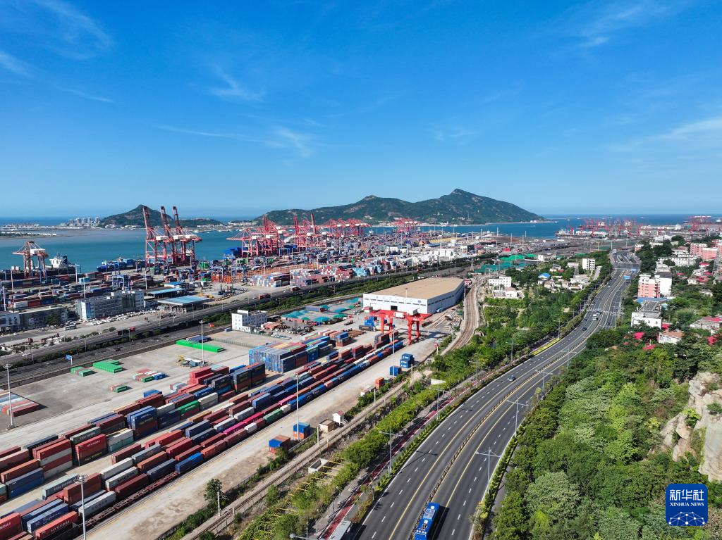 6月26日,货轮停靠在连云港港集装箱码头(无人机照片)。