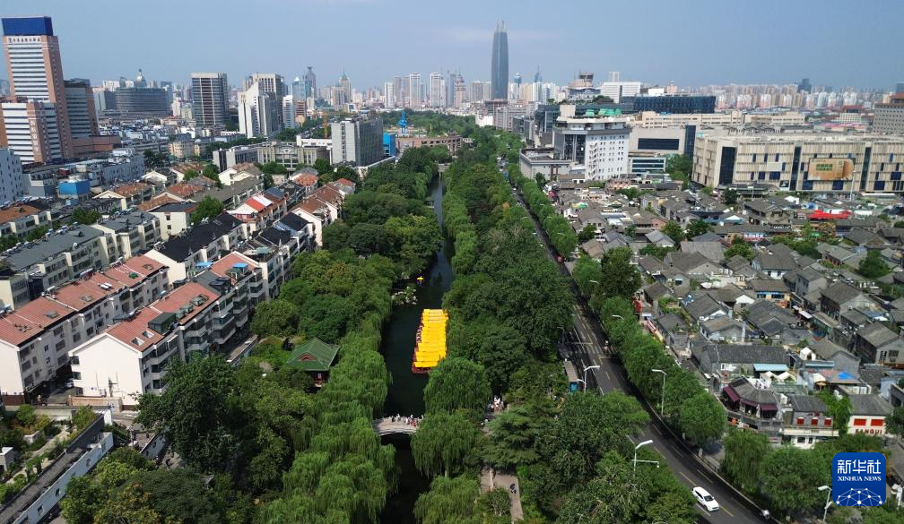 这是7月3日拍摄的位于济南市区的泉水绿道和黑虎泉(无人机照片)。