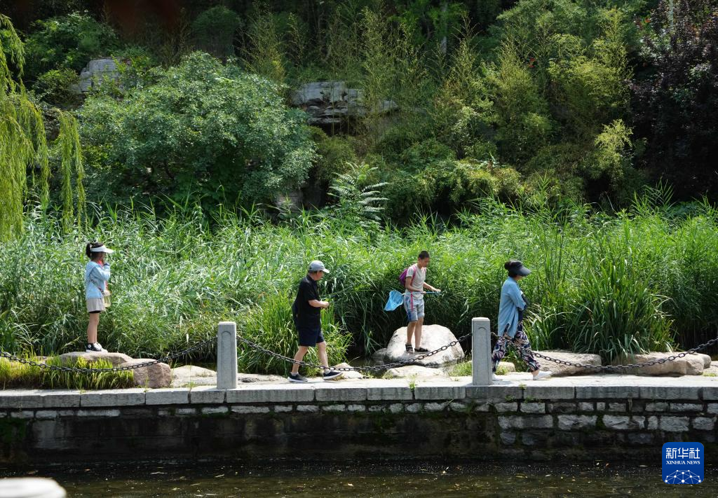 7月3日,人们在济南泉水绿道旁的白石泉游览。