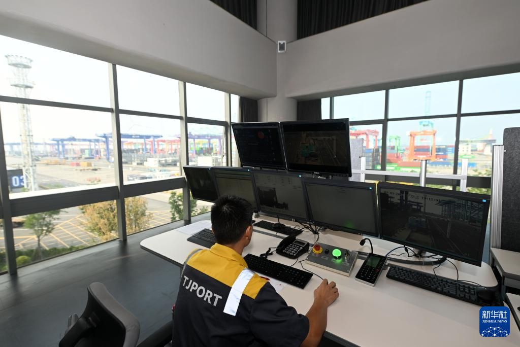 7月3日,在天津港第二集装箱码头有限公司智控中心,工作人员远程测试码头设备。