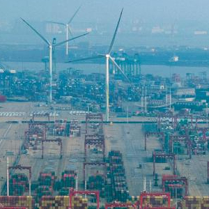 7月3日,一艘集装箱货轮停靠在天津港“智慧零碳”码头(无人机照片)。