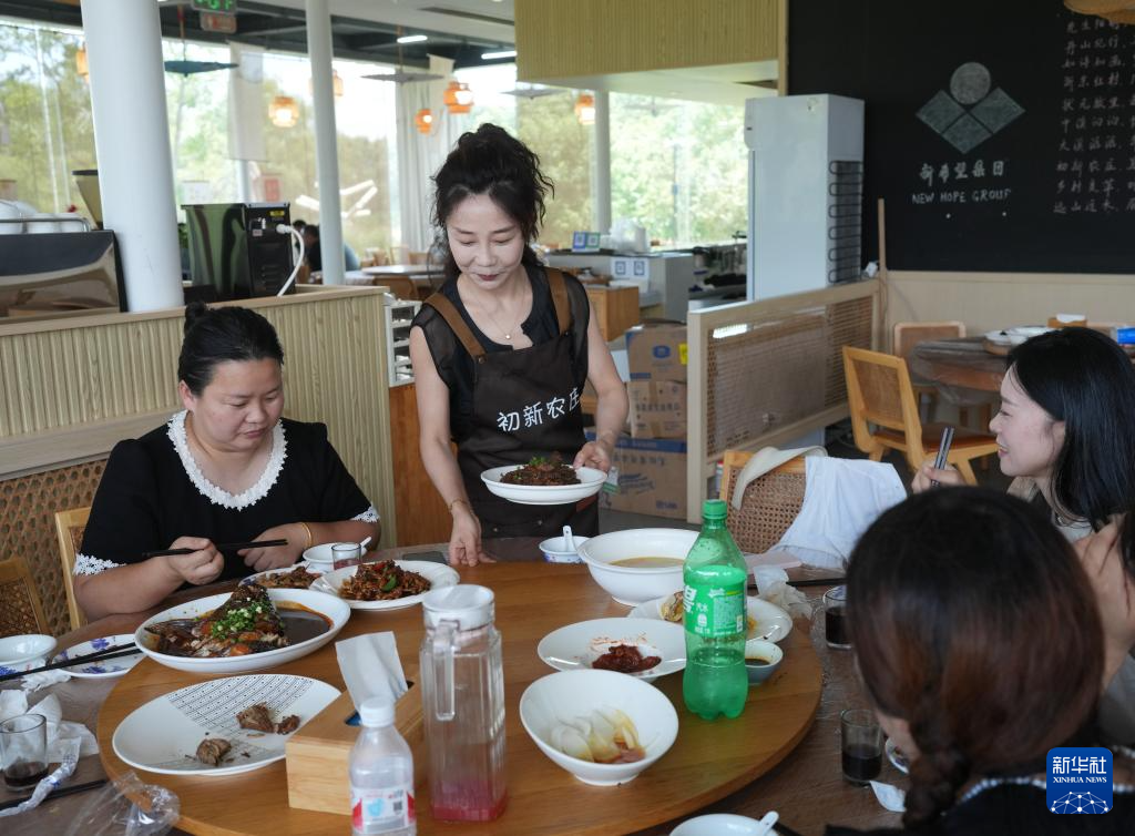 7月3日,在汪巷村设在稻田间的初新农庄,服务员在给客人上菜。