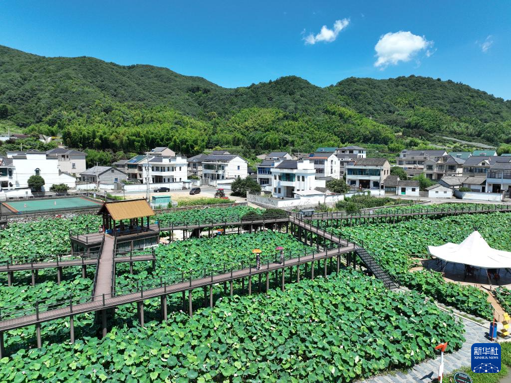 7月3日,游客在汪巷村的荷塘游玩(无人机照片)。
