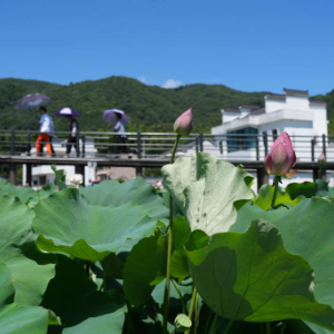 近日,浙江省余姚市梁弄镇汪巷村成片荷花竞相绽放,吸引游客前来赏荷拍照打卡。