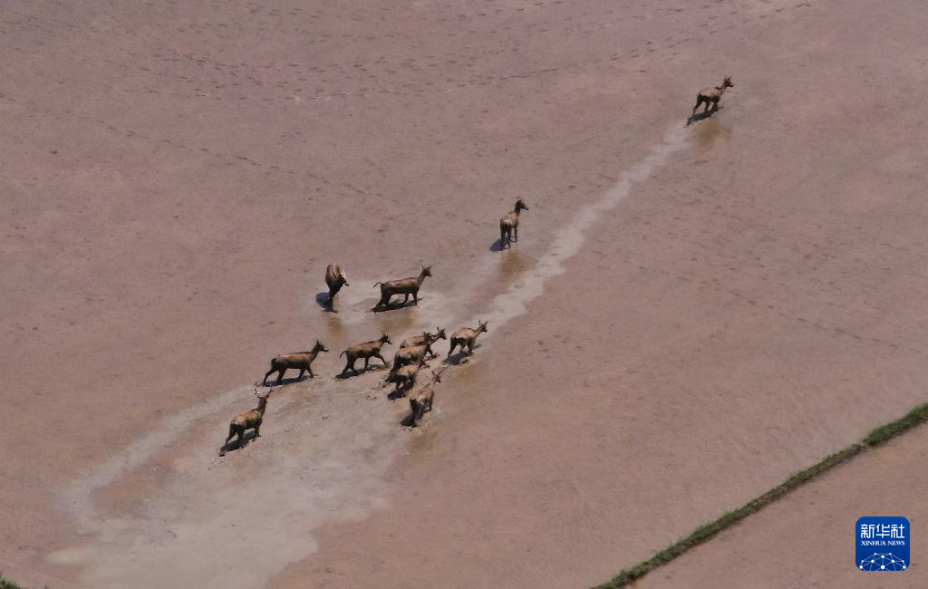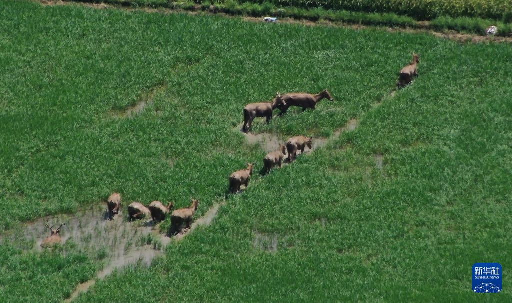 这是在江西省南昌县蒋巷镇拍摄到的麋鹿群(7月4日摄,无人机照片)。
