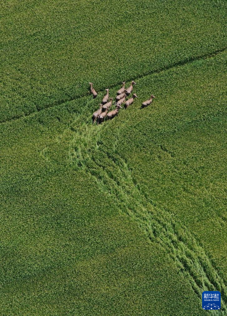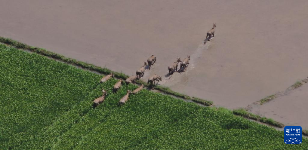 近日长江中下游遭遇强降雨,中国最大淡水湖鄱阳湖水位超过警戒水位2米多。受此影响,在湖区栖息的麋鹿进入到农田中活动。7月4日,在江西省南昌县蒋巷镇,12只野生麋鹿被无人机拍到。据介绍,2013年开始,该省开始实施“麋鹿回家”计划,先后有47头麋鹿被野放鄱阳湖湖区。