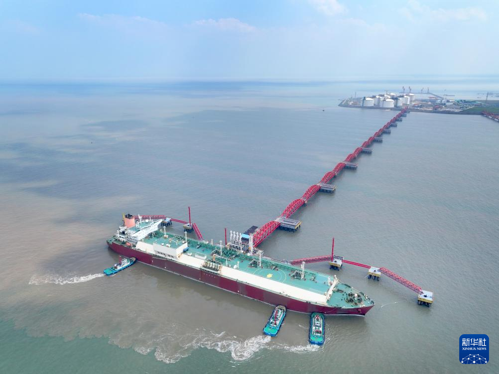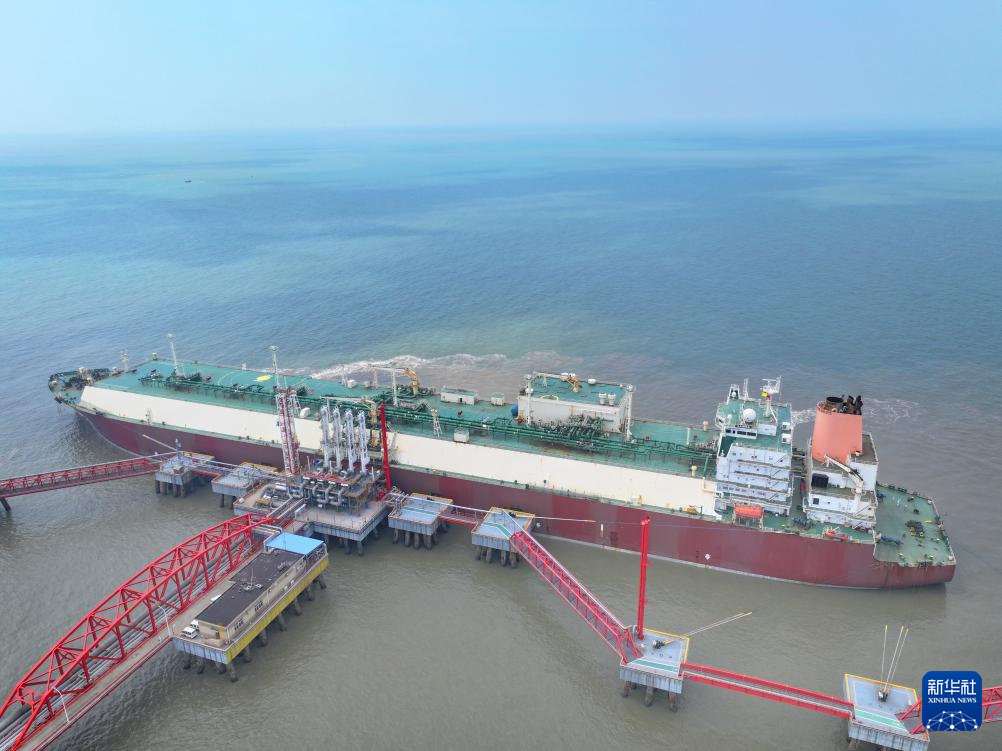 7月5日,来自卡塔尔的LNG船舶“阿米拉”靠泊江苏如东洋口港LNG码头(无人机照片)。
