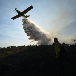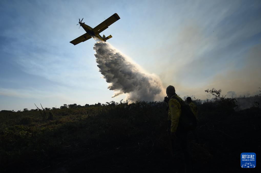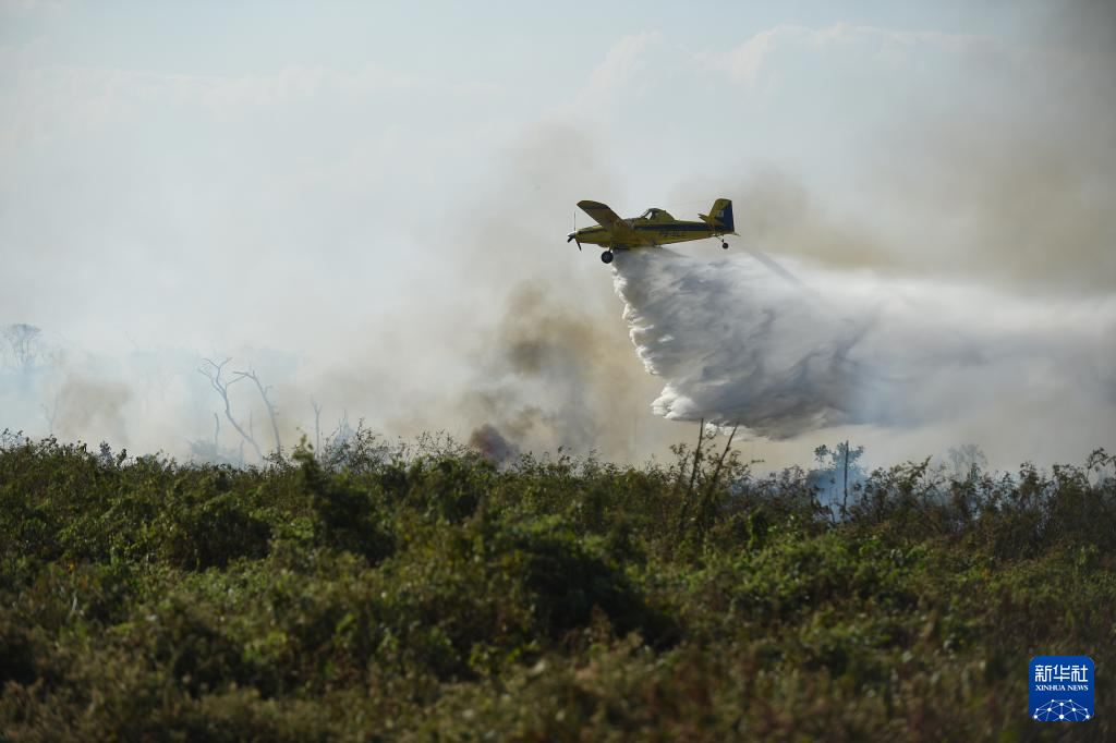 7月5日,在巴西南马托格罗索州潘塔纳尔湿地,一架飞机参与灭火行动。