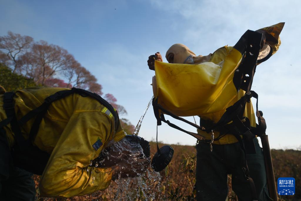 7月5日,消防员在巴西南马托格罗索州潘塔纳尔湿地参加灭火行动时降温。