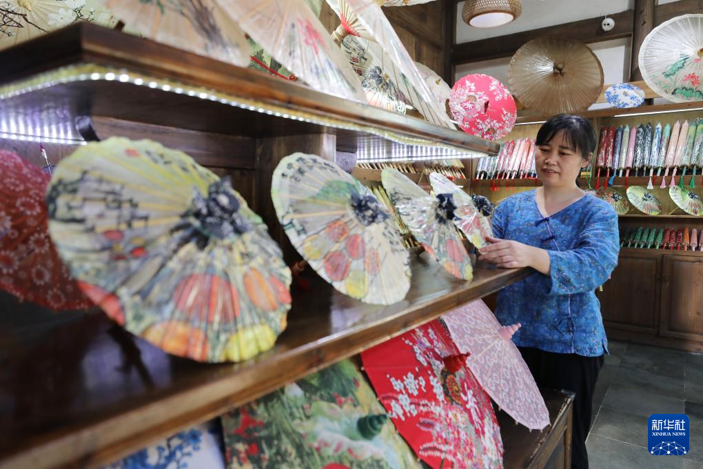 7月3日,在江西婺源篁岭村,销售非遗油纸伞店铺的工作人员在整理商品。