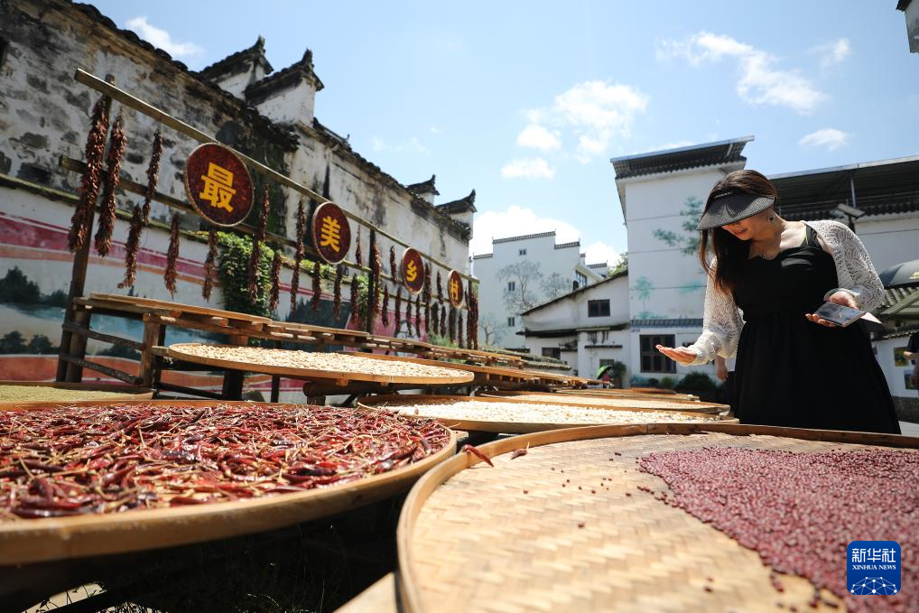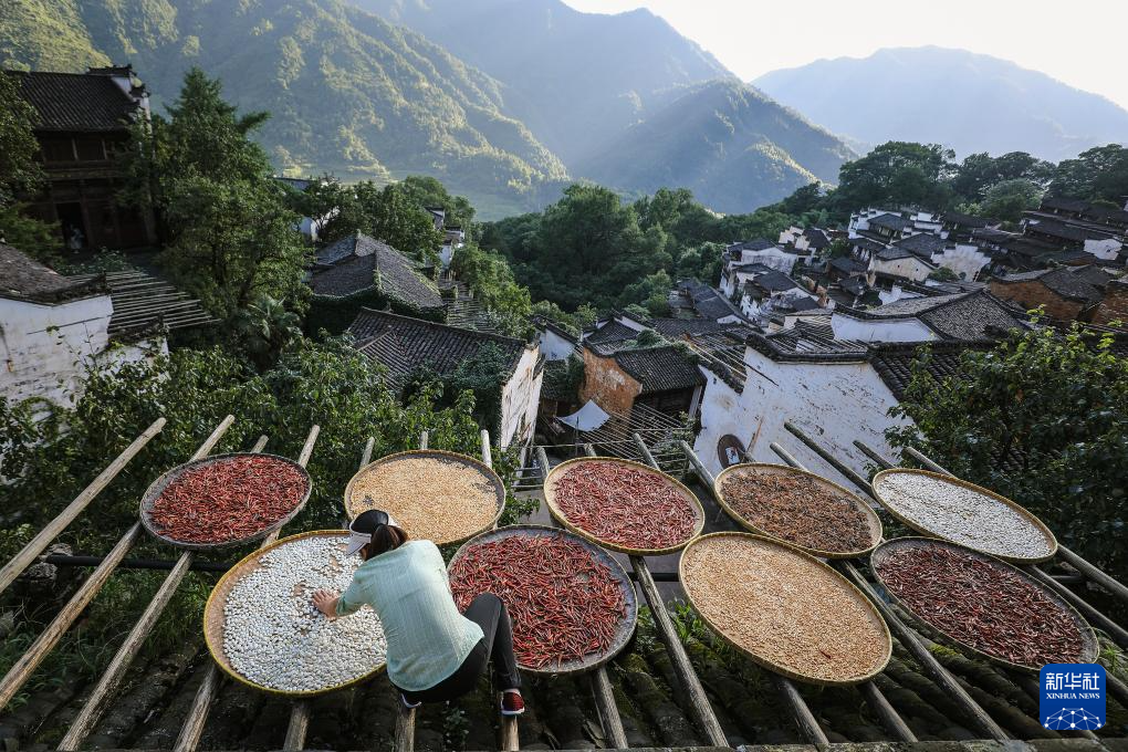 7月3日,景区工作人员在江西婺源篁岭村整理晾晒的农作物。