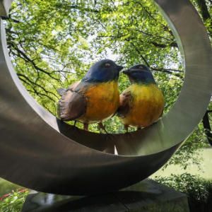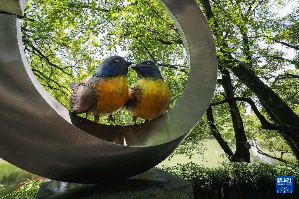 7月3日在江西婺源石门村拍摄的蓝冠噪鹛雕塑。该村有一片濒危鸟类蓝冠噪鹛的栖息区域,当地村民成立了负责巡护的护鸟队。
