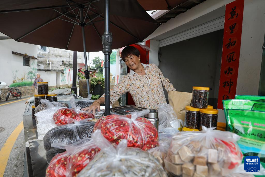 7月3日,在江西婺源石门村,销售特产的村民在整理摊位上的商品。
