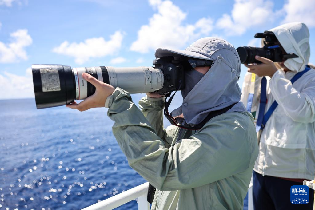 7月5日,在海南岛东部海域,考察团队成员在甲板上拍摄。