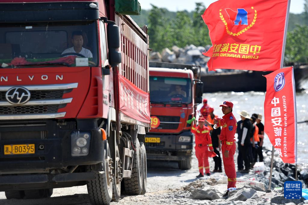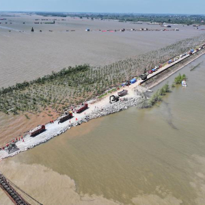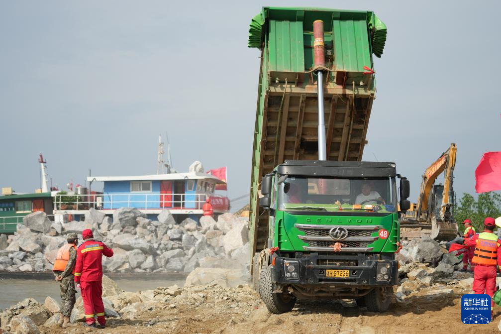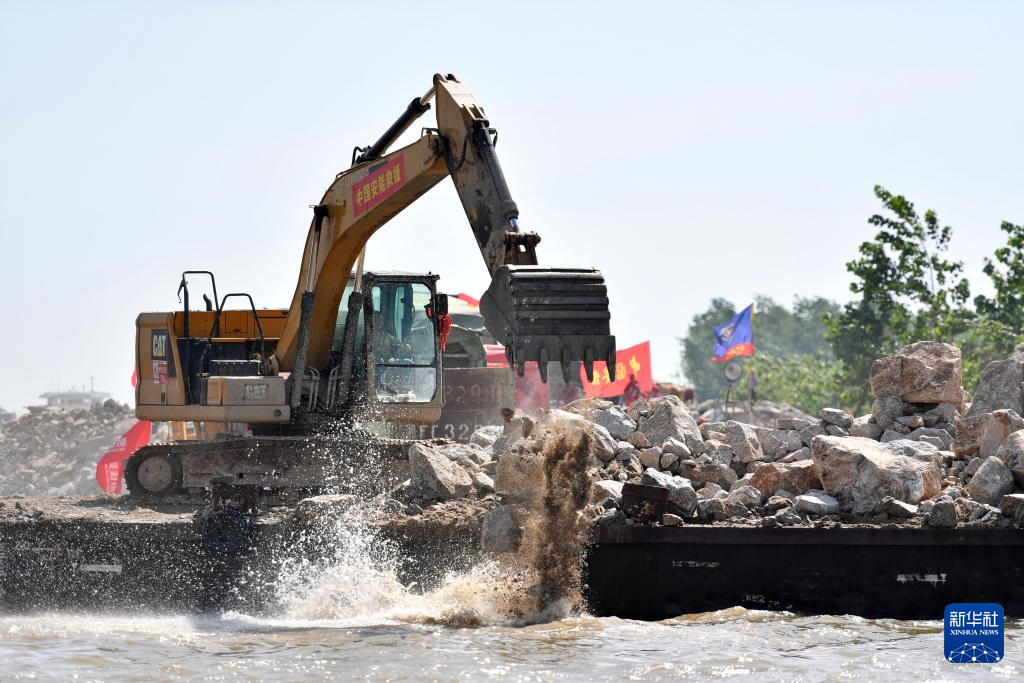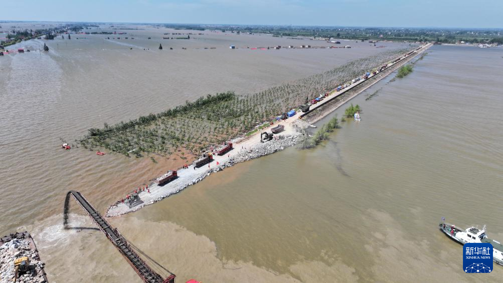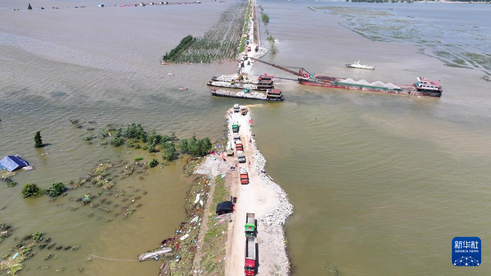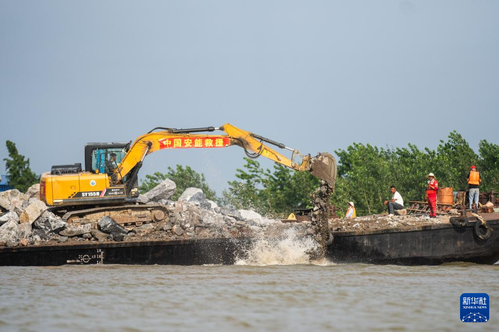7月8日,在湖南省岳阳市华容县团洲垸洞庭湖大堤决口现场,抢险队伍在进行堵口作业。