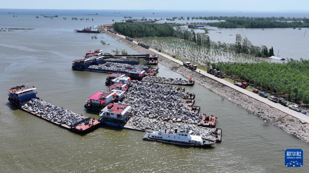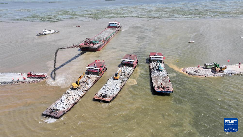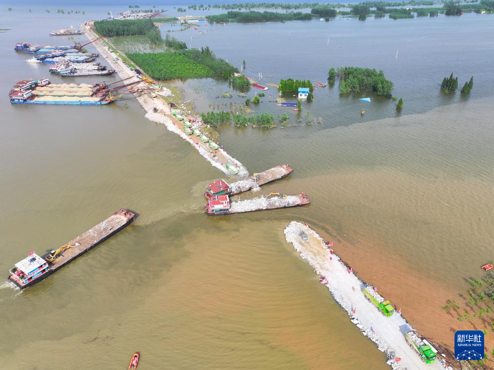 7月8日,在湖南省岳阳市华容县团洲垸洞庭湖大堤决口现场,抢险队伍在进行堵口作业(无人机照片)。