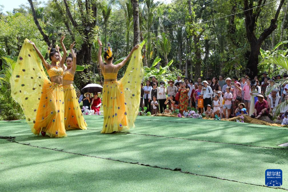 在云南省西双版纳傣族园景区内的传统傣寨曼听村,游客观看户外孔雀舞表演(7月7日摄)。