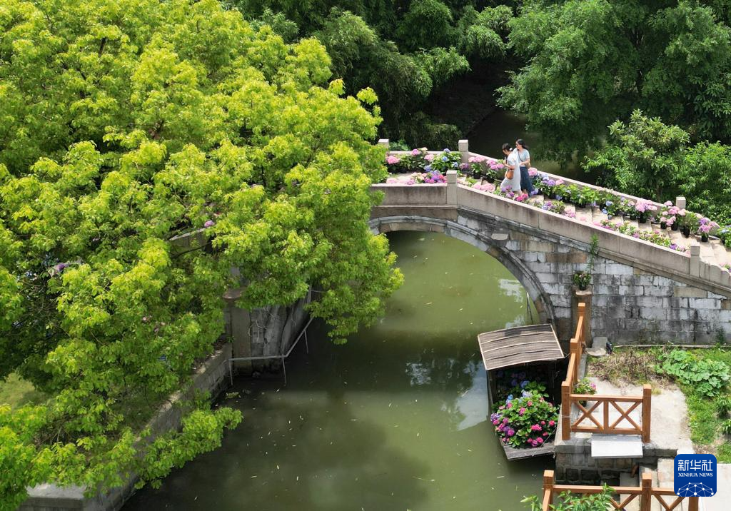 在上海东厍村,人们走过绣球花装点的始建于明代的瑞龙桥(6月4日摄,无人机照片)。