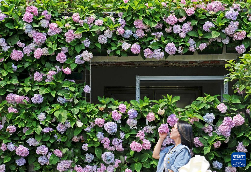 游人在上海东厍村的绣球花墙前拍照(6月4日摄)。