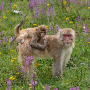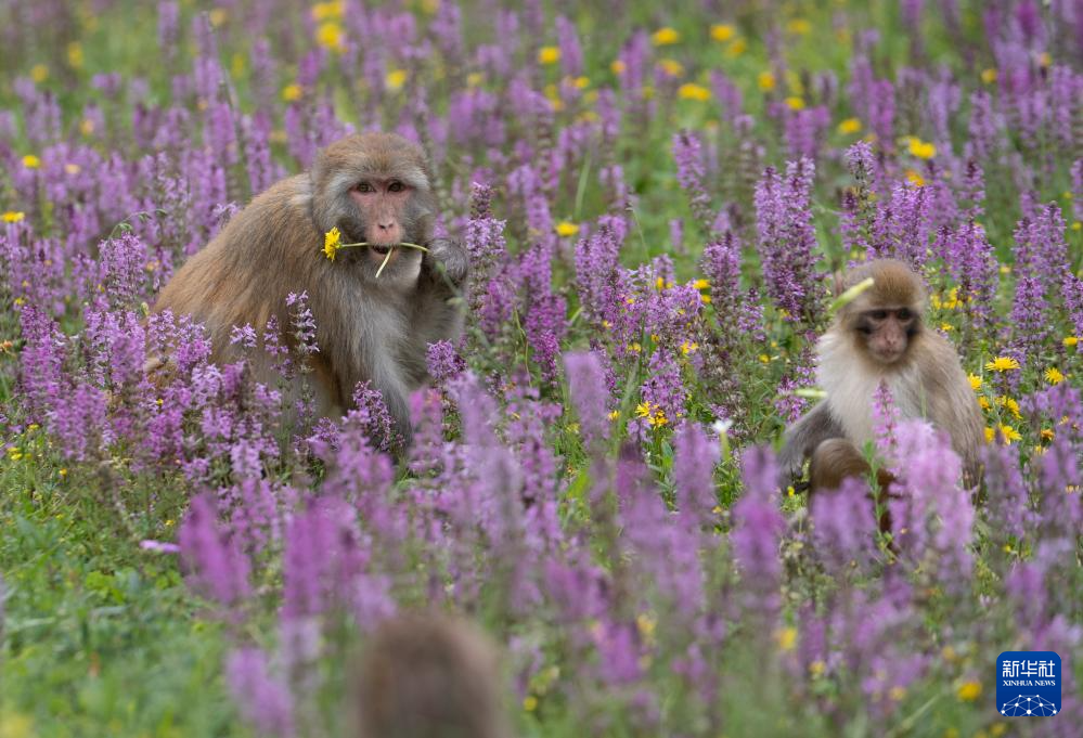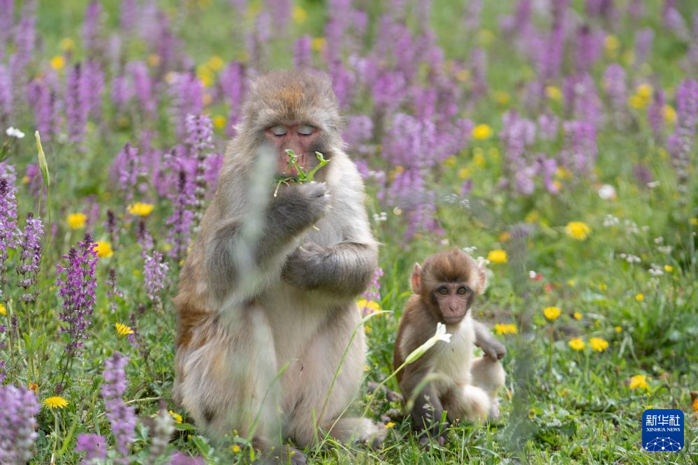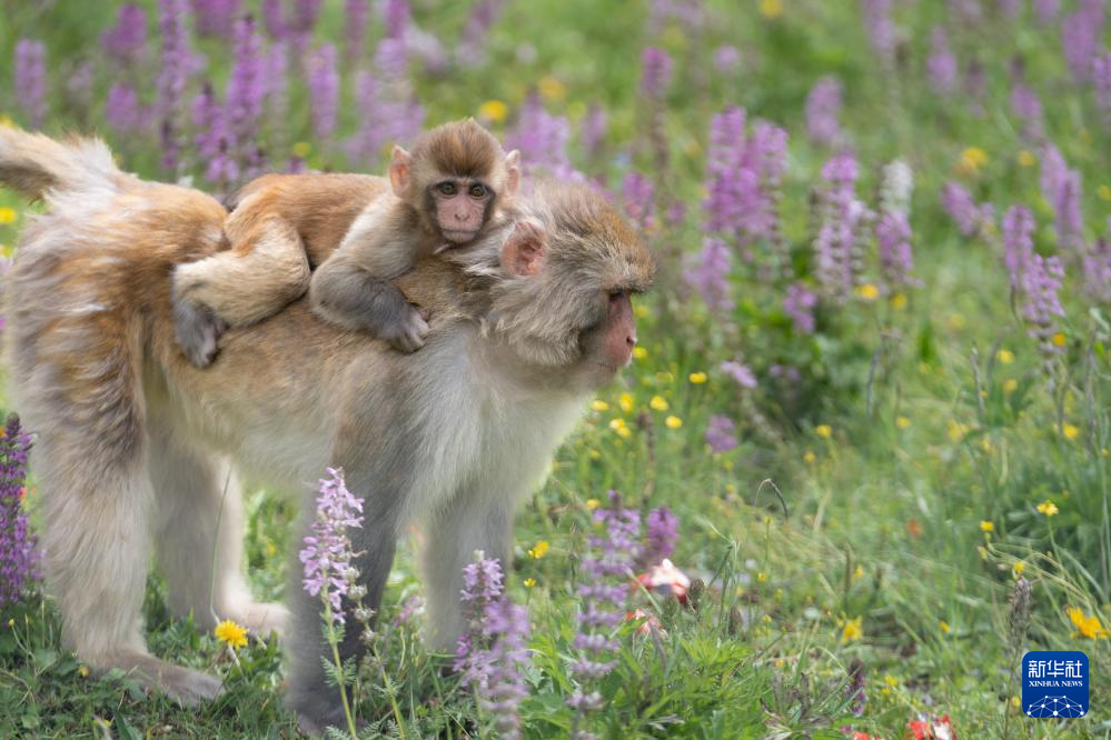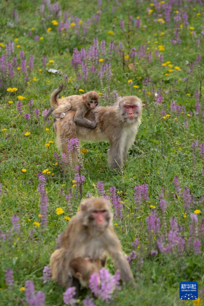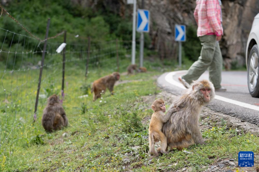 在国道548线四川省色达县翁达镇至色达县城段的路边,一群带着幼崽的藏酋猴在嬉戏和觅食。夏日的川西高原树木葱茏、芳草如茵,为野生动物提供了一个良好的生存环境。