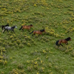 7月10日,在甘肃省张掖市肃南裕固族自治县皇城镇境内的祁连山脚下,马群在草原上奔跑(无人机照片)。