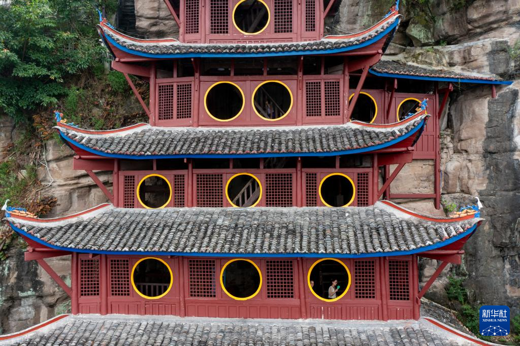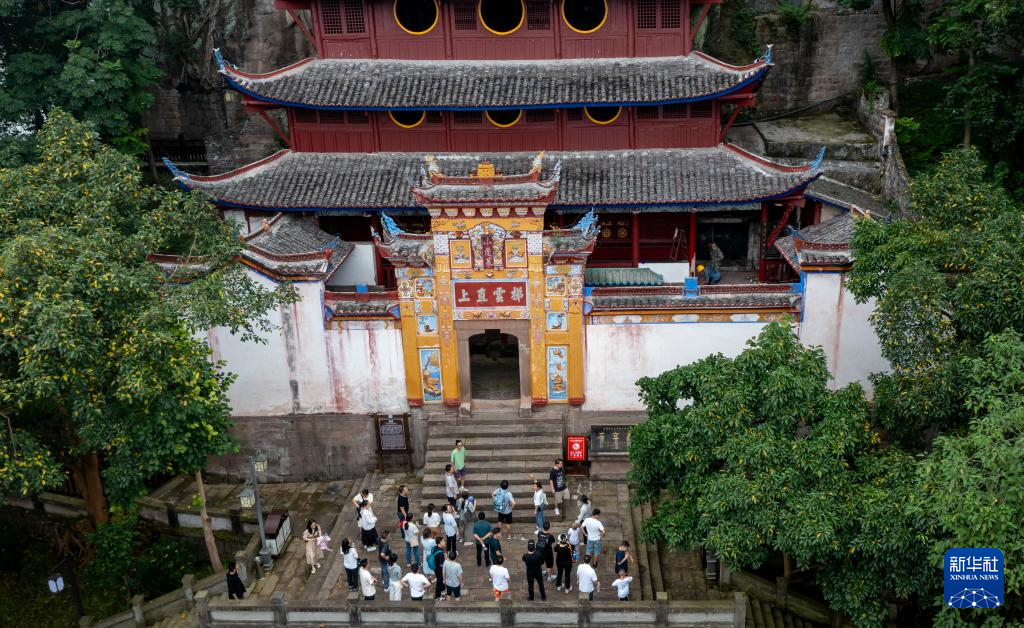 7月10日,游客在石宝寨景区内参观游览(无人机照片)。
