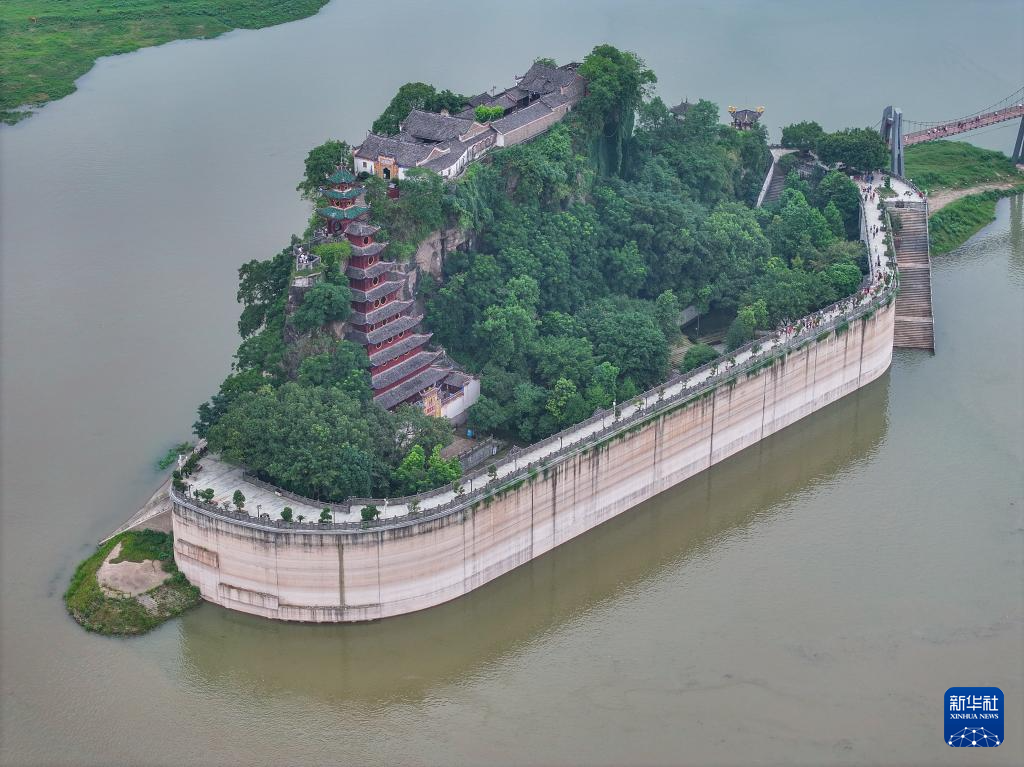 7月10日,两艘游轮靠港在石宝寨码头,方便游客前往石宝寨参观游览(无人机照片)。