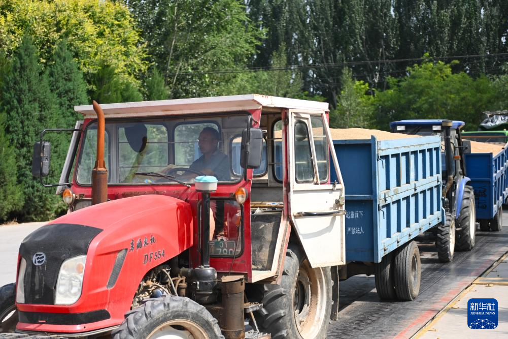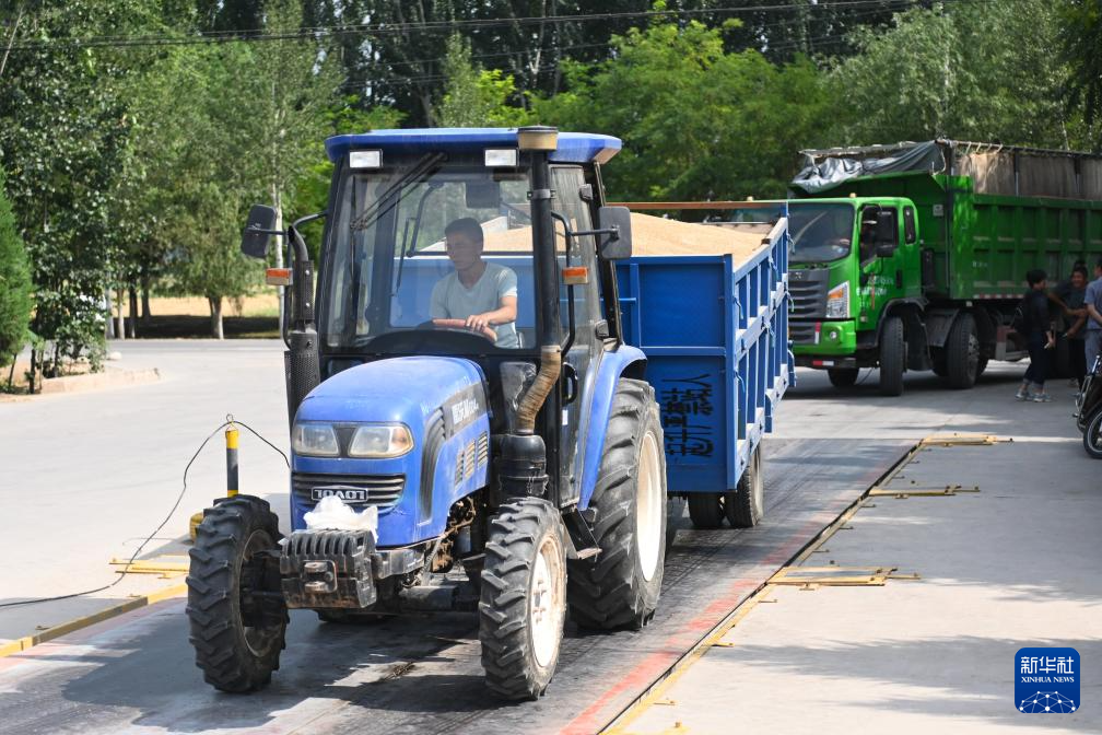 7月11日,在宁夏银川市永宁县一处粮食收购点,农民把装载小麦的农用车停在地磅上称重。