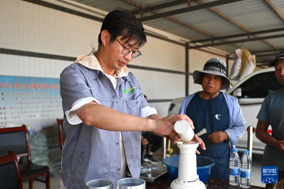 7月11日,在宁夏银川市永宁县一处粮食收购点,工作人员对小麦进行质量检查。