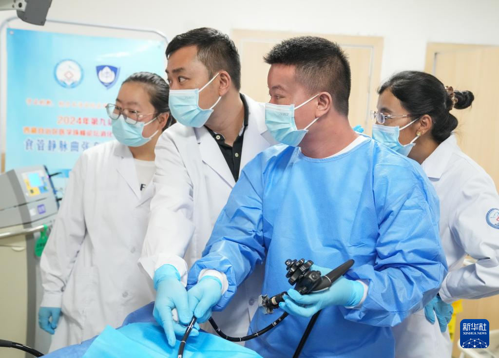 在日喀则市人民医院,段颖骞(左一)在进行内镜手术(7月8日摄)。