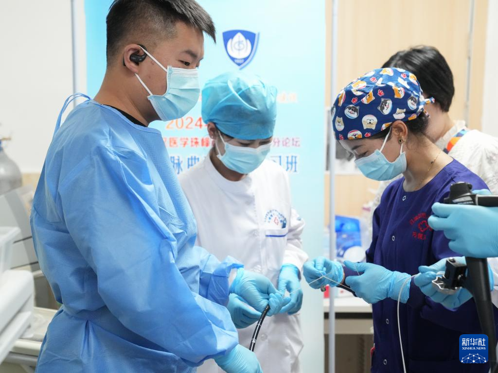 在复旦大学附属中山医院,段颖骞(左)在老师胡健卫的指导下进行内镜手术(6月26日摄)。