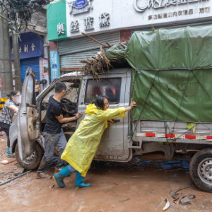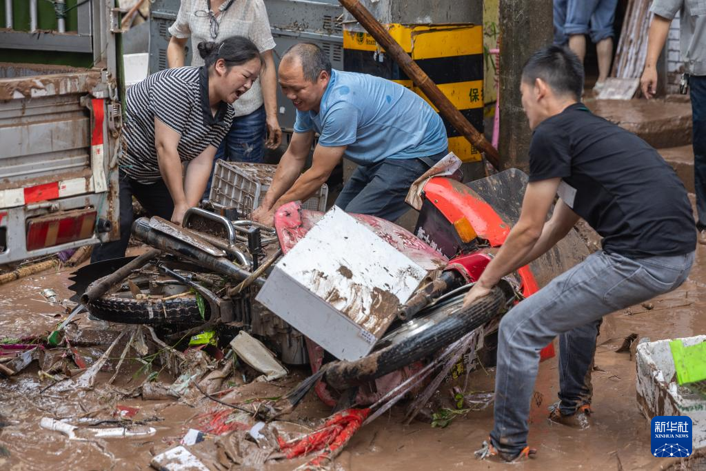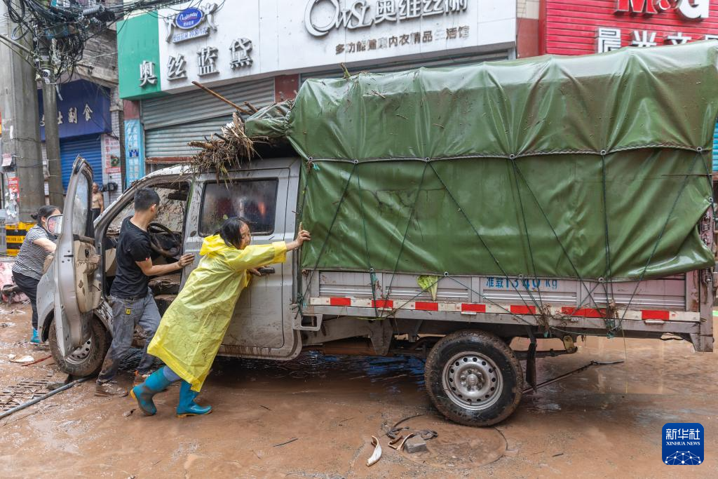 7月11日,在重庆市忠县三汇镇,当地群众清理被洪水泡过的车辆。