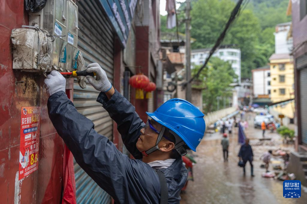 7月11日,在重庆市忠县三汇镇,国网重庆忠县供电公司白石供电所工作人员在洪水退去后检查入户电表线路。