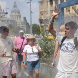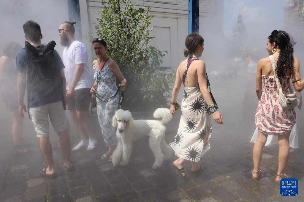 7月11日,在匈牙利布达佩斯,人们在喷雾装置中感受清凉一刻。
