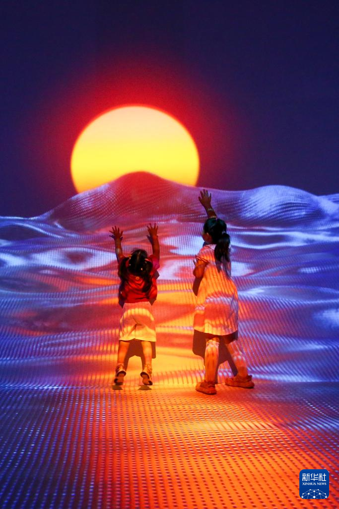 7月13日,小朋友在山东省美术馆参观体验“无限之海”沉浸式AI数字艺术展。